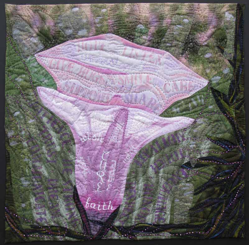 I hope this quilt brings the viewer some measure of enjoyment as well as inspiration from the words printed and stitched in the background: love, faith and courage. The Rosy Periwinkle plant is used to develop the chemotherapeutic agent, Vincristine. This drug was one of several used to successfully treat my son's cancer and I hope it inspires trust that sources of treatment continue to be researched and developed.