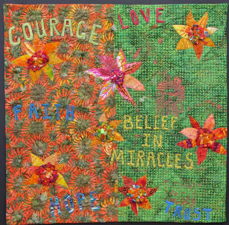 I hope this quilt brings the viewer some measure of enjoyment as well as inspiration from the words printed and stitched in the background: love, faith and courage. The Rosy Periwinkle plant is used to develop the chemotherapeutic agent, Vincristine. This drug was one of several used to successfully treat my son's cancer and I hope it inspires trust that sources of treatment continue to be researched and developed.